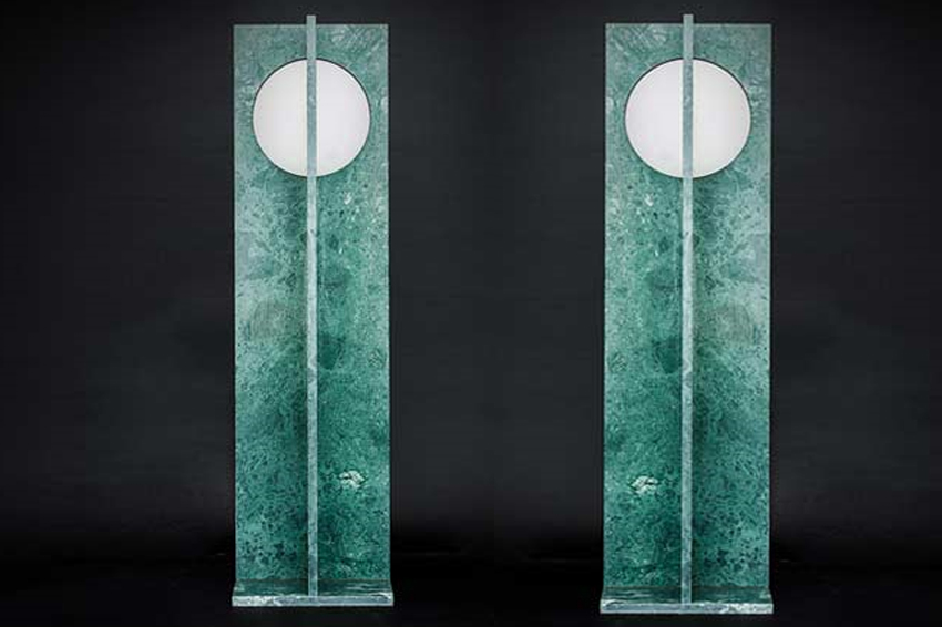 A sculptural floor lamp with two planes that meet at right angles: along the line of their intersection a sphere shines with light that seems able to “overwhelm” the marble, firmly cutting into its presence.