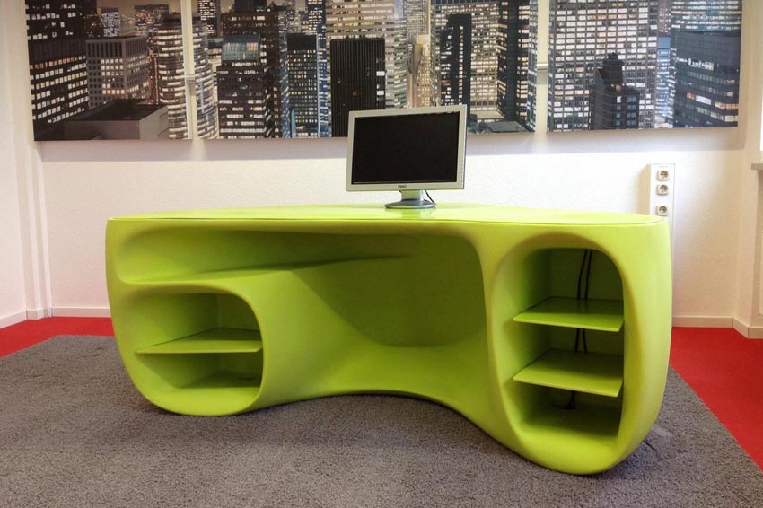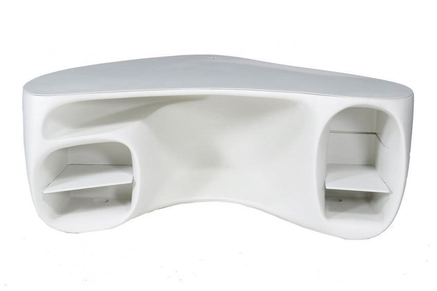 BaObab is primarily a sculptural element made of a one piece body and an additional writing surface. The materials used in BaObab are Polyethylene and the table top is made out of Polyurethane. It embraces the user, protects her or him.