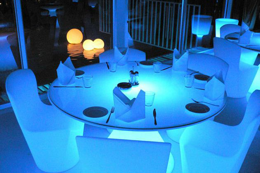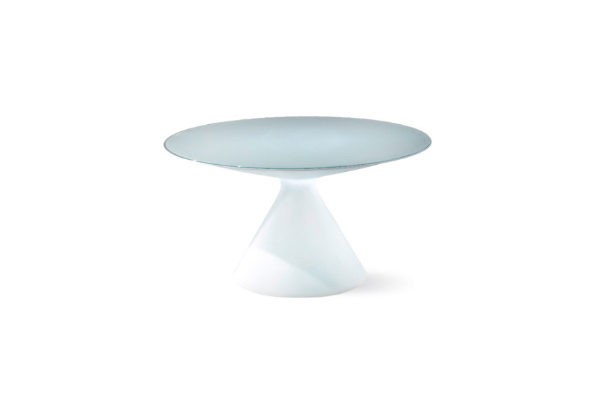 ED is a table with frame in white polyethylene with top in glass.