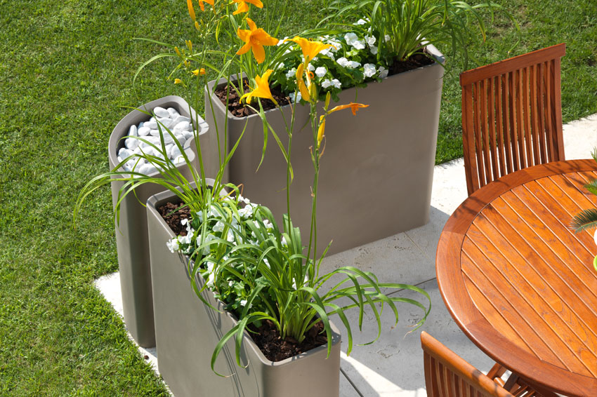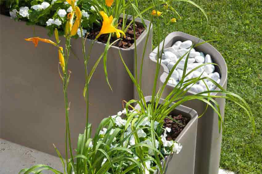 Modular outdoor vases. The simple and essential shape makes it adaptable to any living environment or public space.