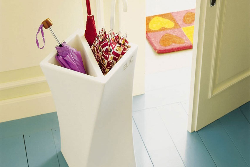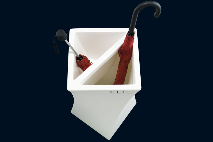 Beauty and practicality. An original umbrella stand with two spaces, suitable for long and short umbrellas. The shallower space can become a roomy empty pocket.
