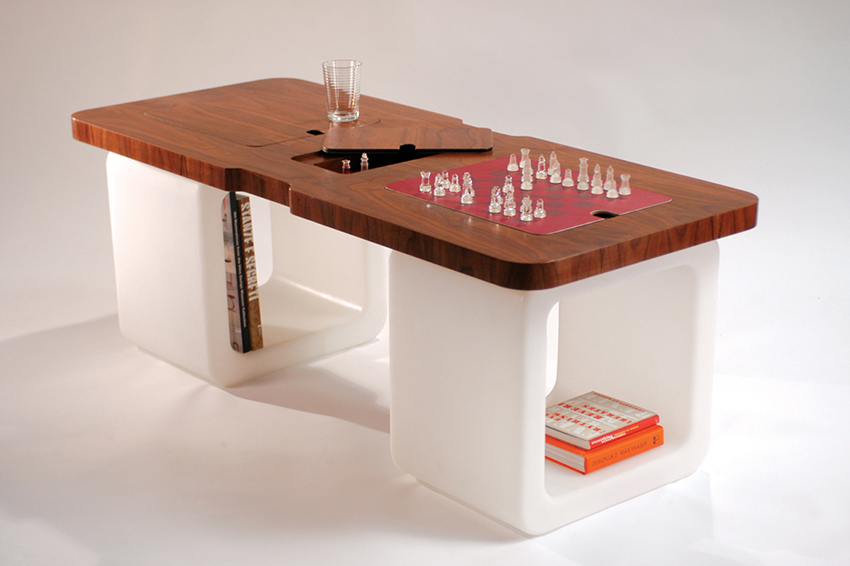 Reverso is a low table with two containers in white polyethylene and top in massive wood.