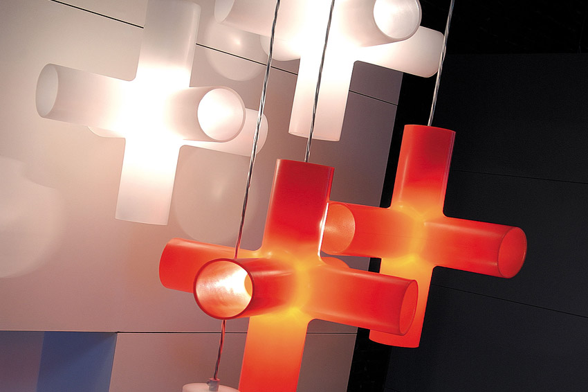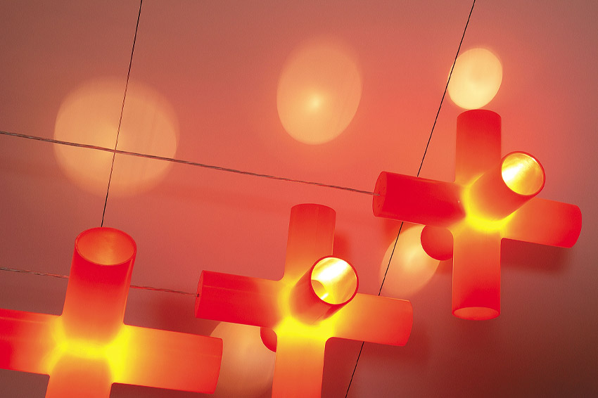 Crosslight is an attractive, double-cruciform hanging lamp composed of cylindrical components 80 mm in diameter. A light bulb at the centre of the cross fits into the uppermost cylinder. The lamp can be used individually or as part of an ensemble
