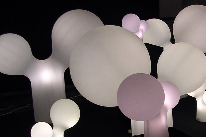 Initially created from blown glass, it was ultimately cast in plastic to ensure durability and uniform color of light. To evenly light the curvy surface, each lamp is fitted with three light sources: one in each bubble and one in the leg.
