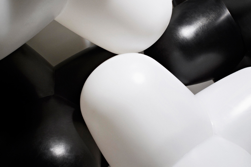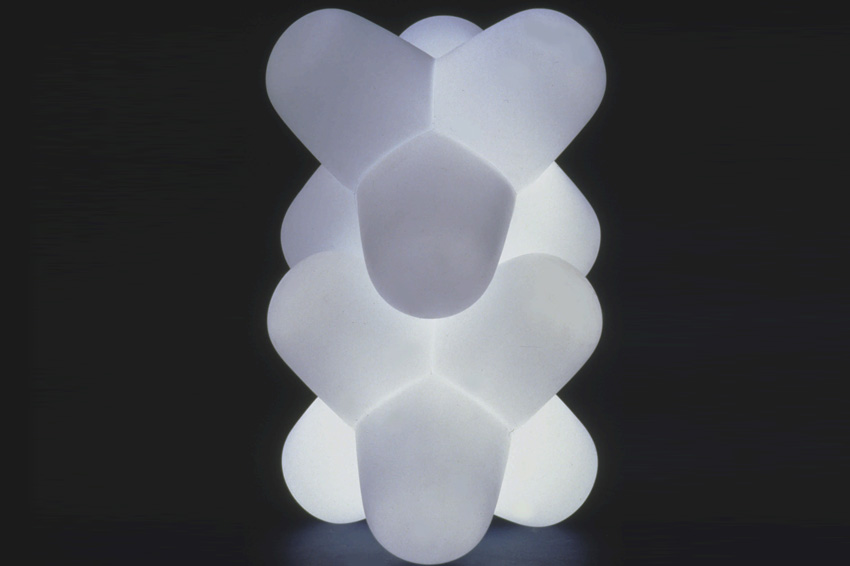 Stackable lighting object made from stable polyethylene in colour orange or white. Useable as a stool, light sculpture or if you put a glass, also useable as a coffee table, nightstand.