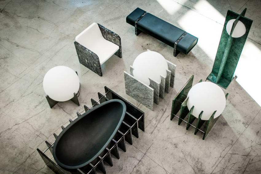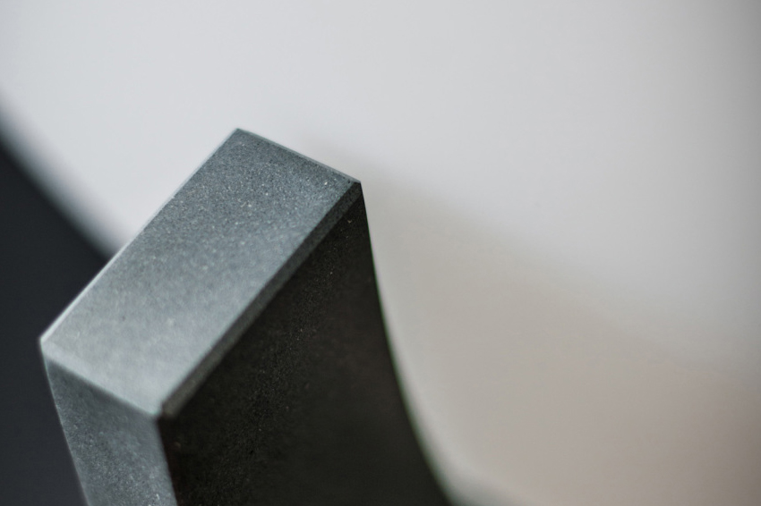 Parallel sheets of marble delineate the space and are intersected by a ball of light. The position of the latter is off-centre and seems to escape from the rigid marble grid.