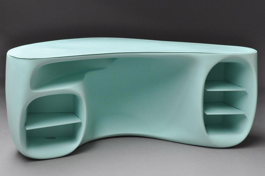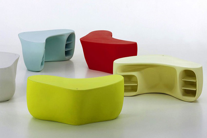BaObab is primarily a sculptural element made of a one piece body and an additional writing surface. The materials used in BaObab are Polyethylene and the table top is made out of Polyurethane. It embraces the user, protects her or him.