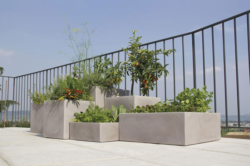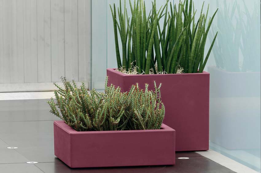 Mubis and Momus are planters with square base, with a matt surface slightly rough, manufactured in resin with rotational technology.