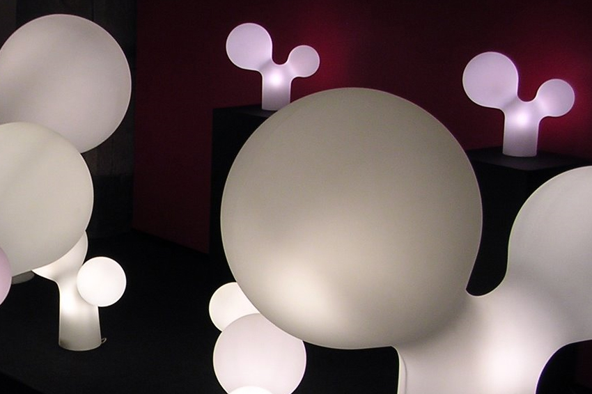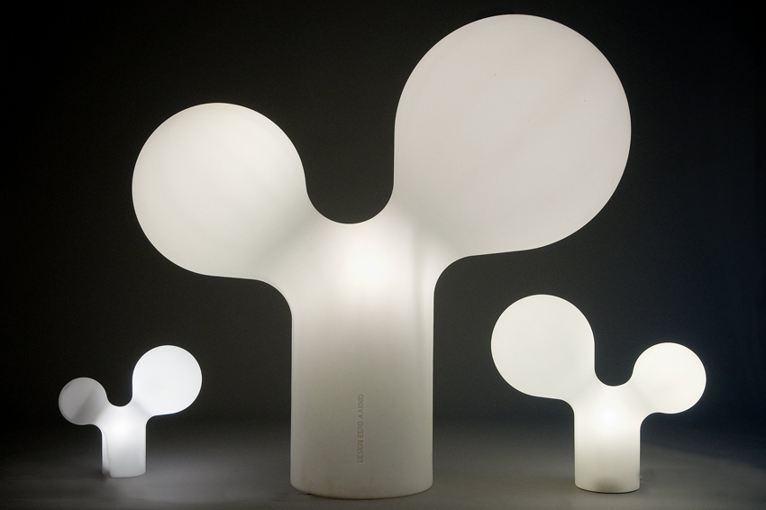 Inizialmente realizzata in vetro soffiato, questa lampada è stata ripensata in plastica stampata in rotazionale con l’inserimento di tre in ciascun glogo e nella gamba centrale.