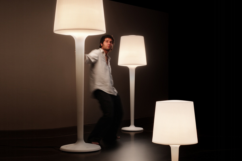 Lampada da terra per uso interno ed esterno, realizzata in polietilene stampato con tecnologia rotazionale. Disponibile anche nella versione tavolo.