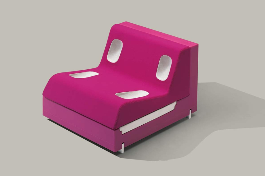 Seduta in polietilene prodotta con sistema rotazionale e dotata di struttura in metallo e bande elastiche di molleggio. Imbottitura in poliuretano espanso flessibile. Il rivestimento superiore è sfoderabile.