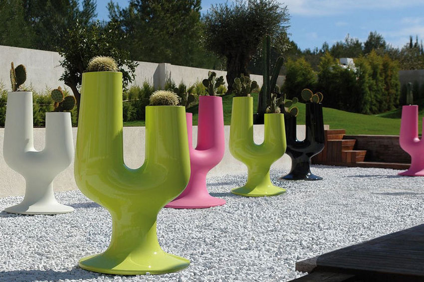 Due piccoli vani porta piante ricavati dalla forma stilizzata di un cactus oversize dal basamento stabile che rimanda agli anni ’60.