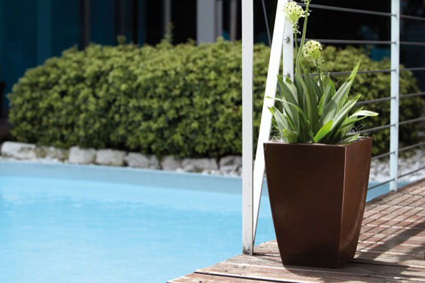 E' un vaso a base quadrata, prodotto in resina con superficie matt, leggermente ruvida al tatto, di qualità superiore e con un design moderno.