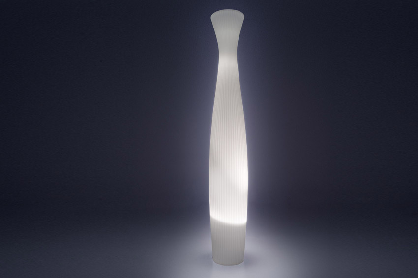 Sinuosa presenza da esterni e interni, dove l’effetto plissettato della superficie rende questi vasi luminosi più morbidi e vestiti.